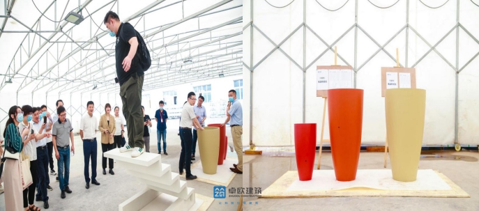 在參觀我司UHPC超高性能混凝土產(chǎn)品生產(chǎn)車間時(shí),各位專家及參會(huì)代表對(duì)我司各種UHPC樣品及產(chǎn)品表現(xiàn)出濃厚興趣,并切身體驗(yàn)了我司UHPC一體成型樓梯,對(duì)其優(yōu)異質(zhì)量與穩(wěn)固性贊不絕口;位于樓梯一側(cè)UHPC超高性能混凝土花缽也吸引了大家的目光,該花缽是法國(guó)當(dāng)代建筑大師讓·努維爾為上海恒基旭輝新天地項(xiàng)目設(shè)計(jì)的立面元素,恰當(dāng)而又充分的利用了UHPC的超高力學(xué)性能,裝飾性能和耐久性能的特點(diǎn),建成后將成為上海老城區(qū)一處亮麗優(yōu)美的風(fēng)景。
